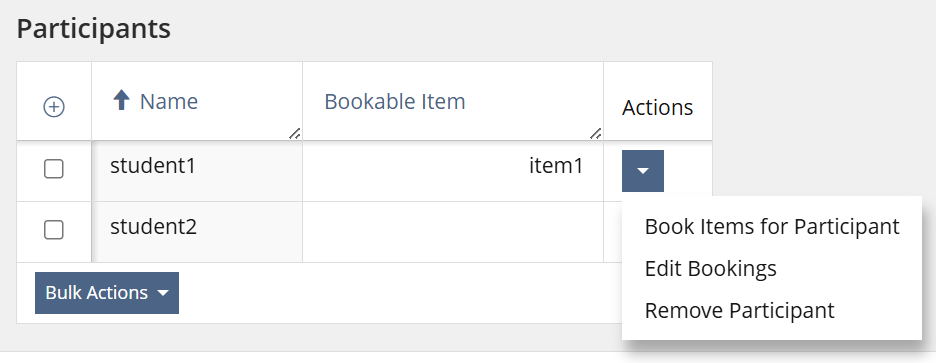 Within this Feature Request, the table "Participants" is moved to a KitchenSink table. The described action is added to the Actions dropdown menu.