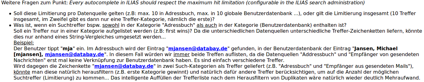 - Every autocomplete in ILIAS should respect the maximum hit limitation (configurable in the ILIAS search administration)