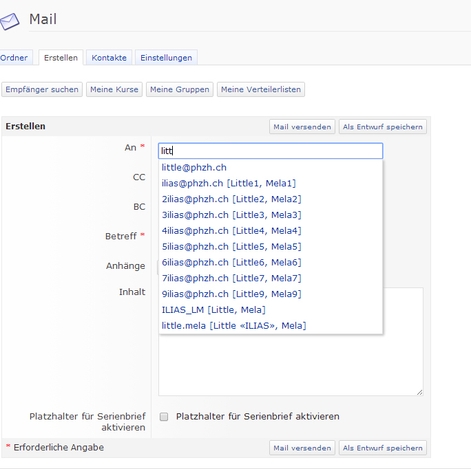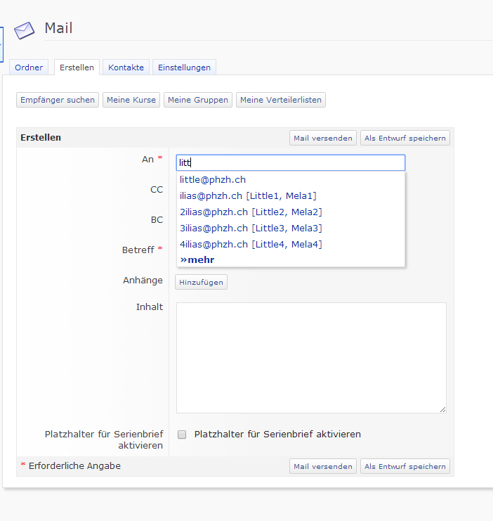 - Mail > Compose > Search Recipients (PH Zürich)