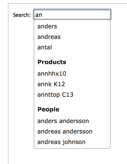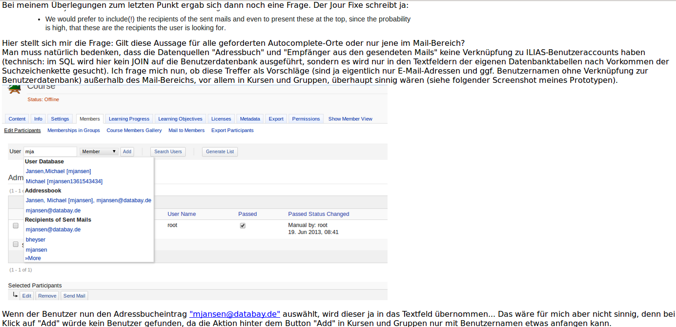 - The autocomplete user interface should be able to display grouped items/section headers (e.g. if ILIAS found 10 items in the addressbook database tables and 10 items in the global user databse table, a section header should separate these two data sources, comparable to Twitter, flickr, last.fm, ...).