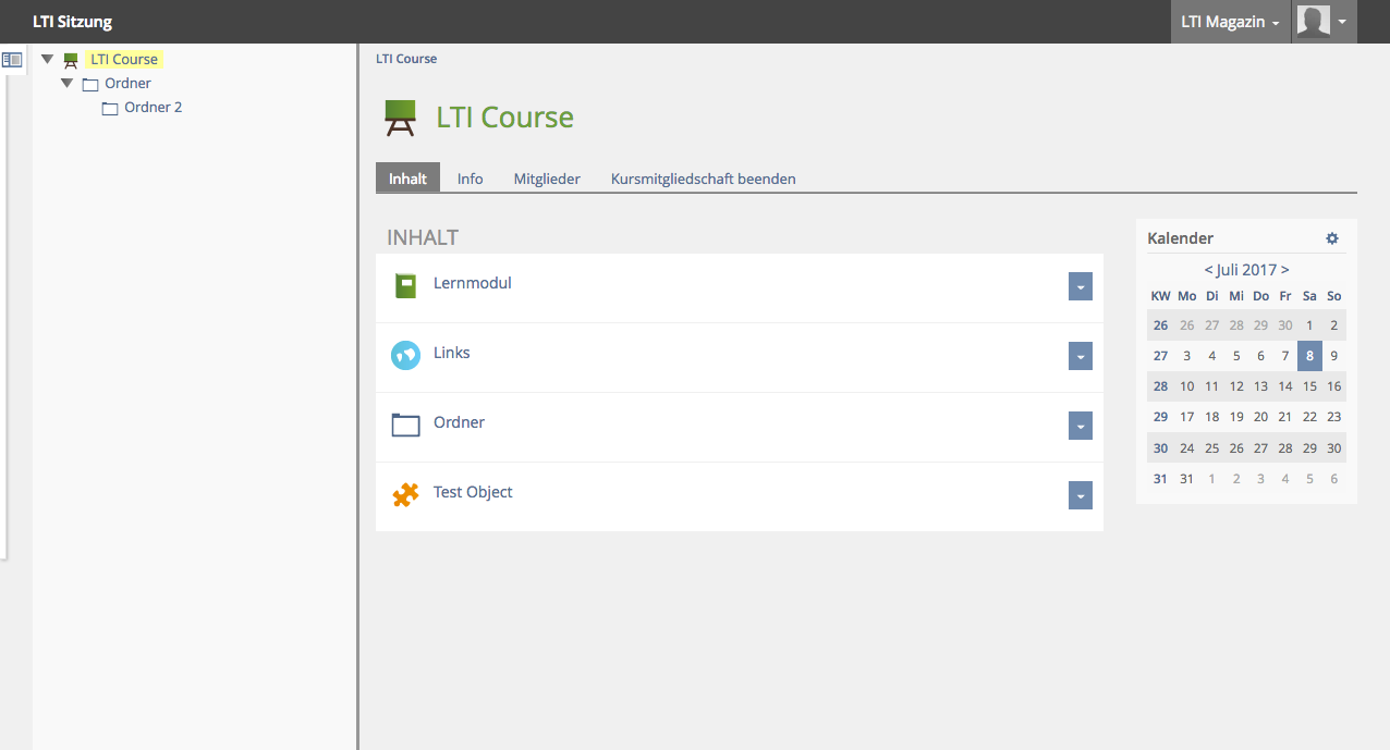 Due to the restriced navigation, the user may navigate to external objects from linked objects in the current lti context. To avoid any dead end navigation the Topbar may provide a LTI Magazin (the wording may be discussed, similar to the "ILIAS Magazin"), but with the fixed root of the initial LTI Object. The user may navigate on any time back to the initial LTI Context Object. And why not offer the same helpful last-visited list as in the normal ILIAS view. We should discuss this against the background of the concret Optes Learning Use-Case which offers a lot of linked courses within one LTI Session. The root of the locator and tree always changes to the current container object (sub container items of the initial LTI root context are also set as tree and locator root) It is possible to restrict the behaviour to special container objects like crs, grp and any combinations as desired (defaults to all container objects hard coded):