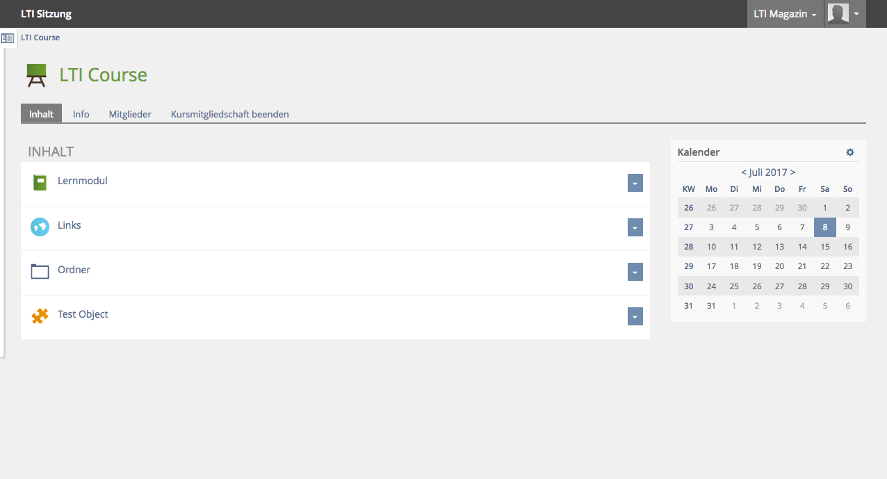 - To avoid dead-end navigation a "LTI Magazin" Droplist is introduced in the right topbar, which is comparable to the root "Magazin" navigation in the main menu entries but rooted to the initial LTI context object and also supports a list of last visited items (see Screen 3)