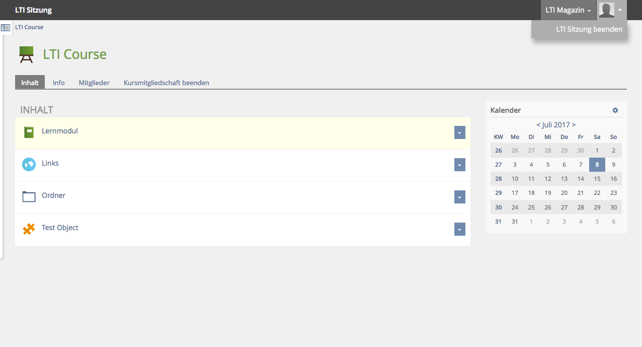 The LTI Session provides a minimalistic Topbar with hidden Footer and starts within the given LTI Object: