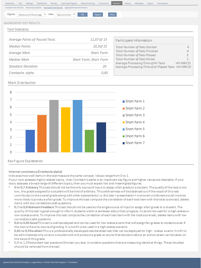 JourFixe, ILIAS [jourfixe], 07 JAN 2019 : We accept the key figures suggested above in chap 2 for the test item statistic. But we need a clear presentation of the result screen incl. textual information about the different levels (number of levels per key figure and text information). It is important for us that this information is helpful for test authors to improve their tests. These are not just numbers but important information that need an appropriate visual representation. Please consider to use the reporting panel instead of a simple table to visualise this information.