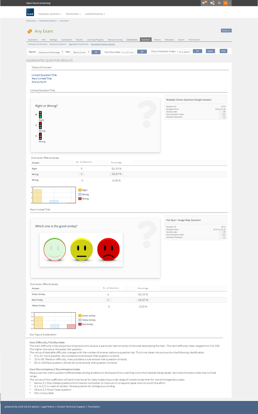- We need a clear distinction between test statistic and test item statistic. Test item statistics focus on the use and the results of one question in several tests. But this requires a feasible solution for the lifecycle of a question (at the time being every question in a test is a destinct copy and could be changed completely which makes every statistic useless).