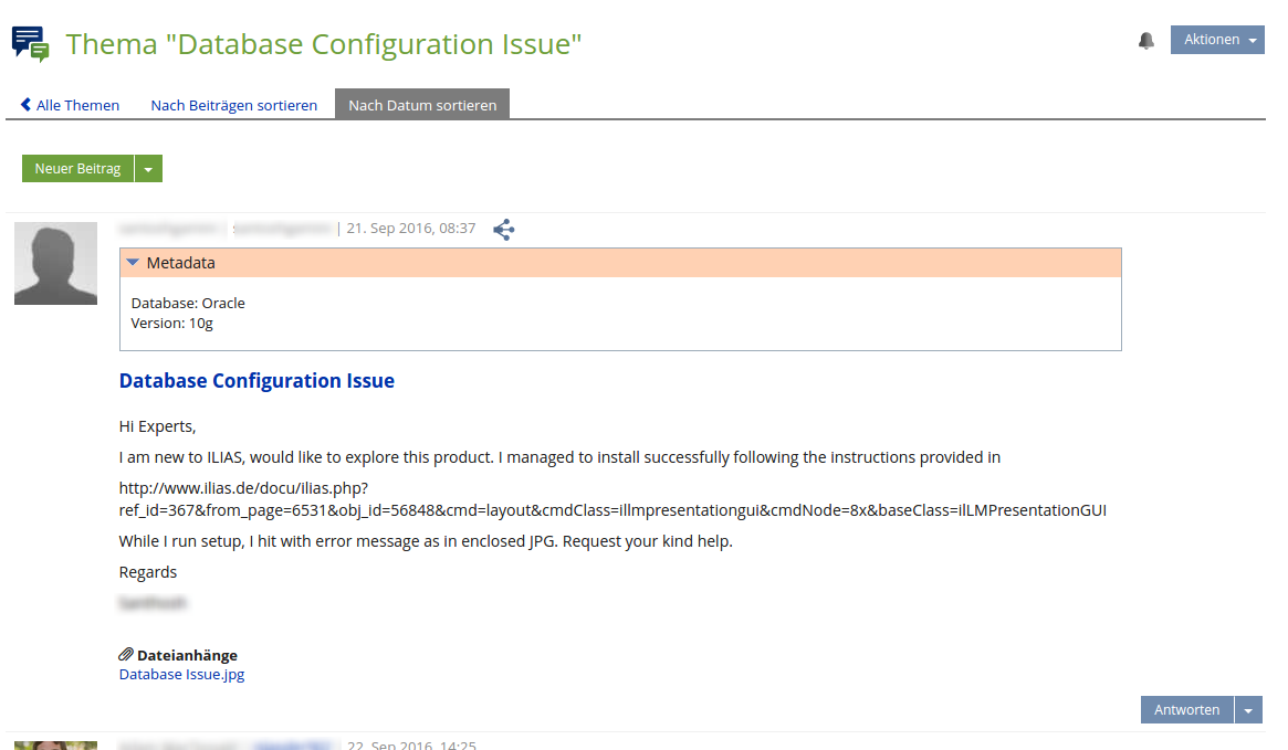 For example certain postings in different/comprehensive threads of the ILIAS "Administration - Installation - Core" forum addressing database topics for ILIAS installations could be markes as "Oracle relevant" by assigning a concrete value "Oracle" to the metadata field "Database", available in this forum.