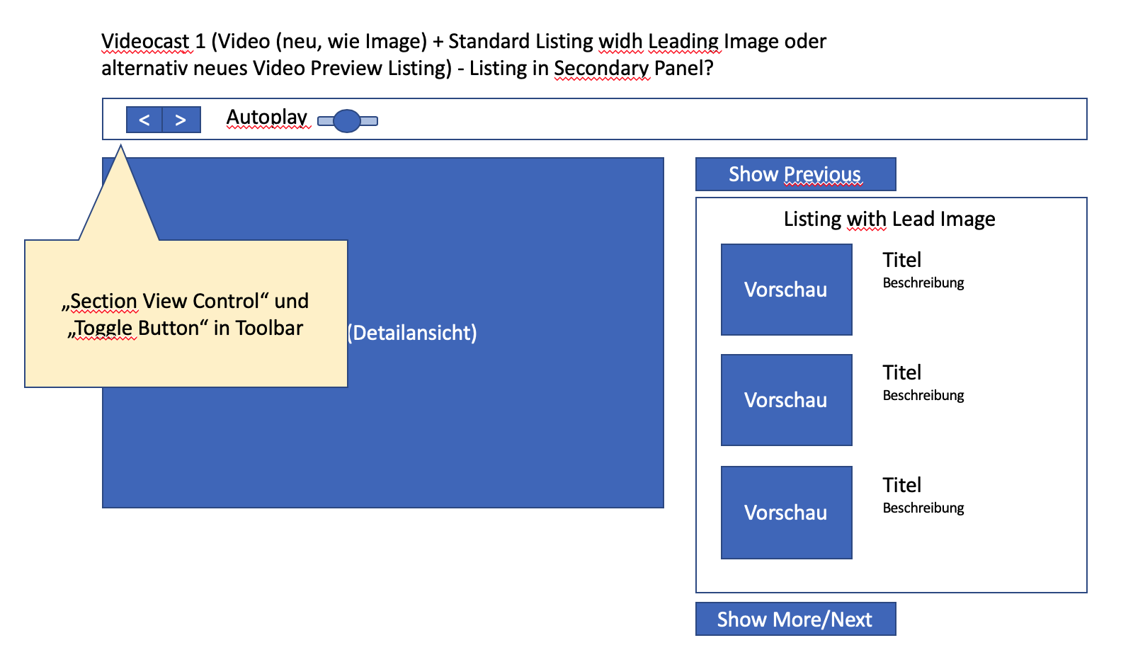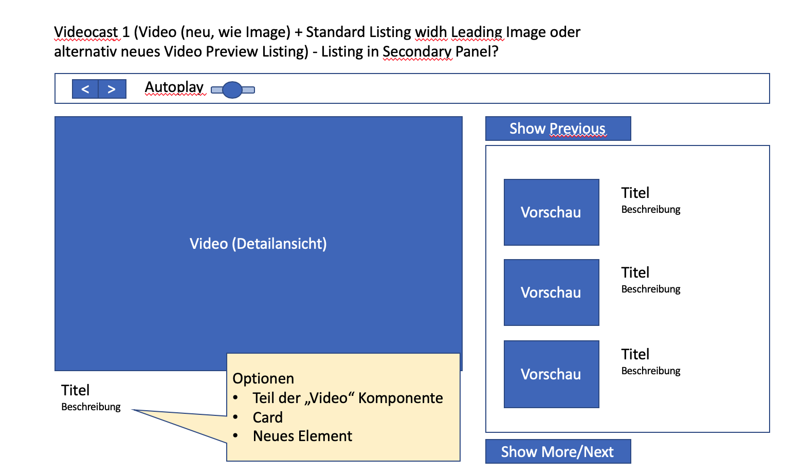 - What I am missing as an important usecase is a start screen, where a user sees all videos at once when he opens the mediacast. Other video portals also have an overview of several videos in a first step, before going into a detail mode where a video is in focus (we ask ourselves: which one is the first or the last or a selected one?). We also assume with a video podcast that a user needs a certain overview of all videos (e.g. lecture recordings) in order to select a specific one. In the proposed solution only a limited selection is visible and I have no chance to get a quick overview of all offers.