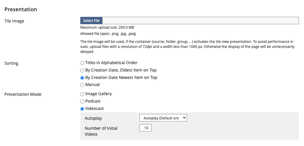 - Autoplay: Administrators can activate an autoplay function for this presentation and assign the standard setting for users (default: autoplay available + autoplay active)