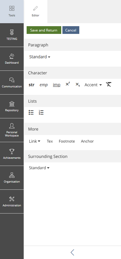 Text is the central page element for providing information. Already with ILIAS 6 formatting and functions have been moved into slate. However, it needs more overview, adjustments to the handling concept, easier and more intuitive usage.