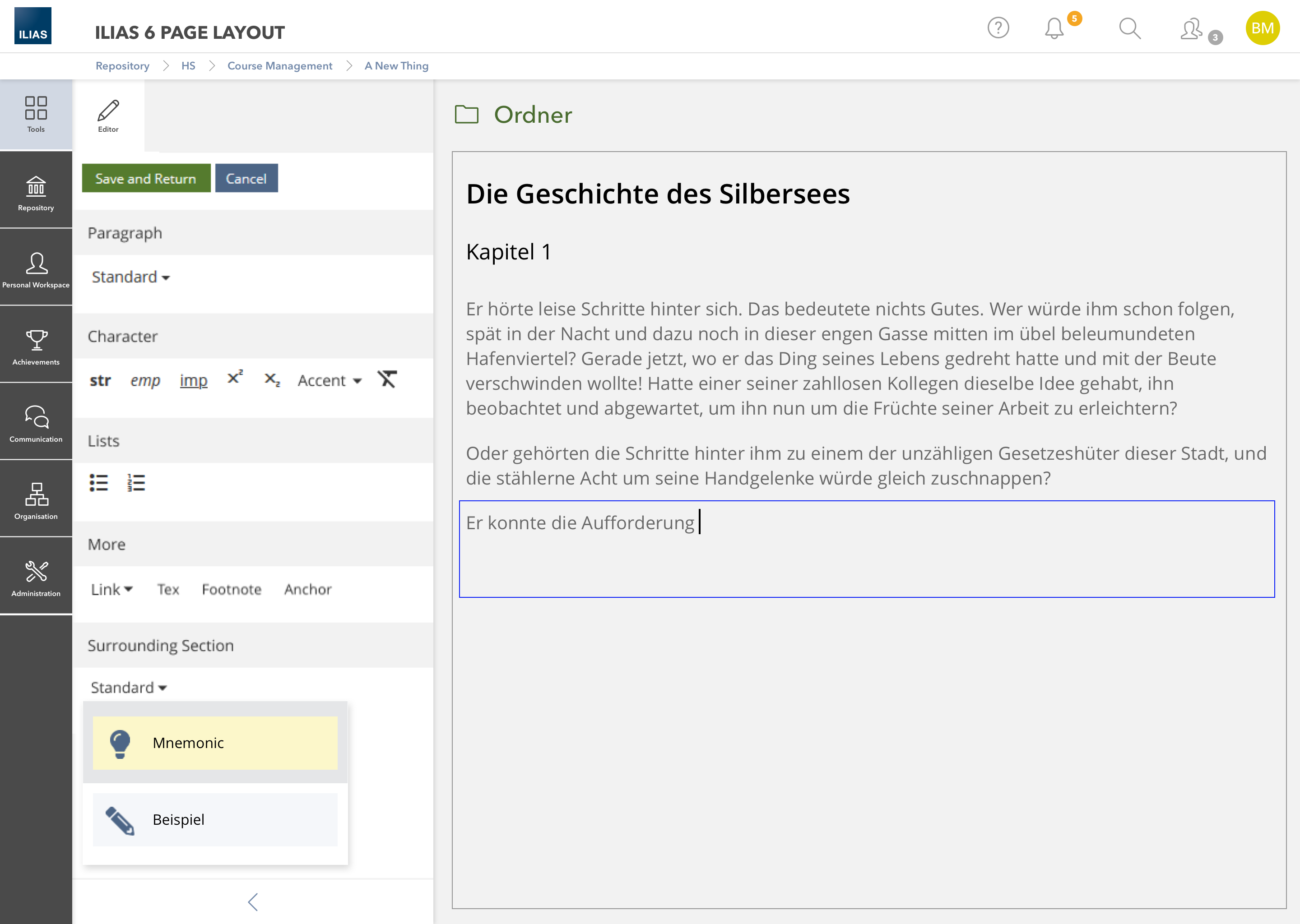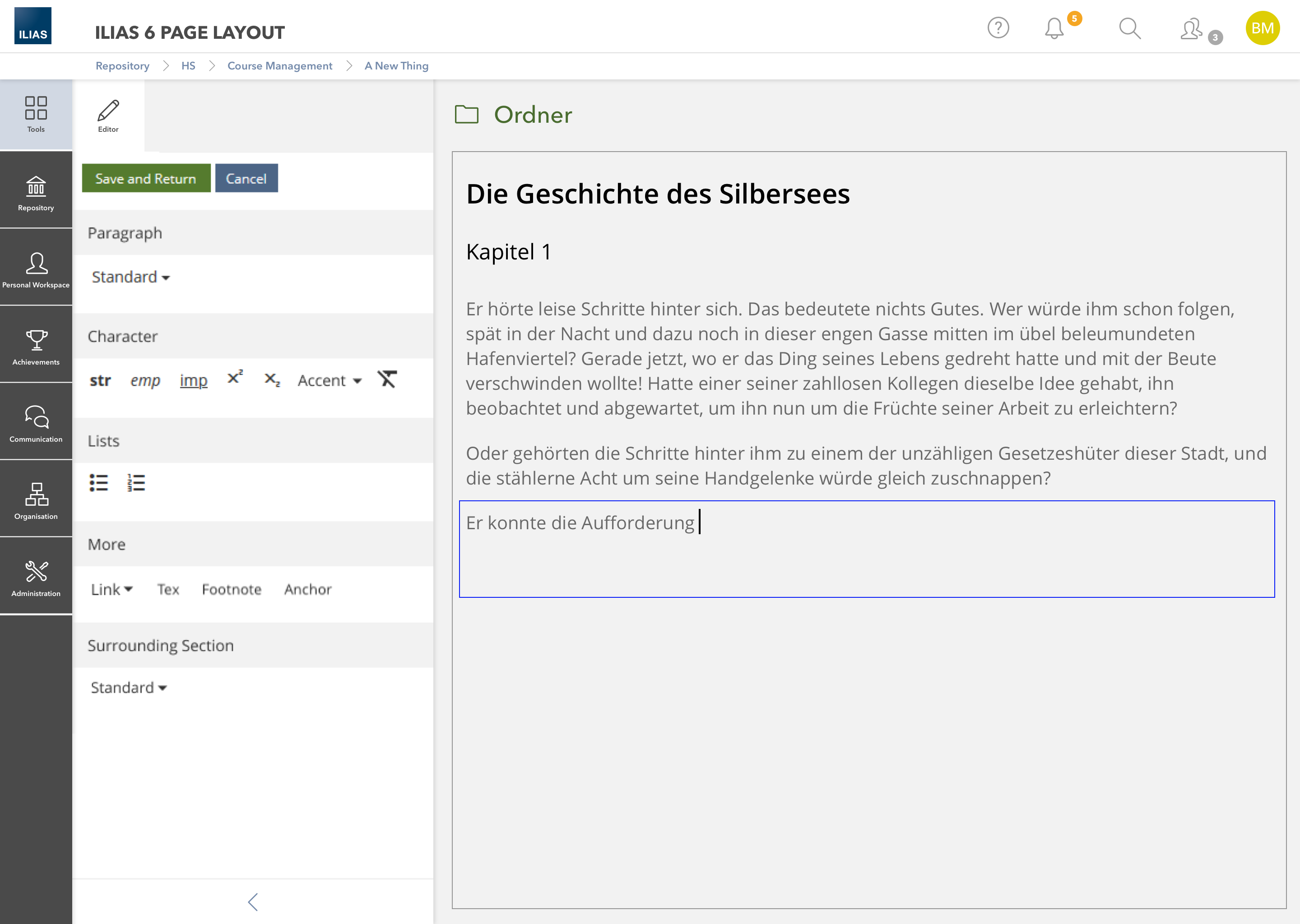 - The paragraph formats for text are strongly cleaned up and redundancies to sections formatting are removed. Headings and alignments are offered via a standard repertoire of paragraph formats. Typical ILIAS semantic markup is used for this purpose